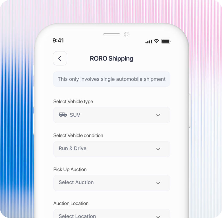 We can pick up vehicles from any U.S. auction or address. After collection, your vehicle is shipped via RORO or container—based on your selected method.
